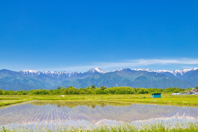 穂高駅から信濃大町駅にかけての沿線には、田園風景が広がるのどかな里山の景色が続きます。毎年5月になると田んぼに水が張られ、晴れた日には北アルプスの雄大な山並みが水面に映り込む「水鏡(みずかがみ)」と呼ばれる幻想的な風景が至る所で見られます。