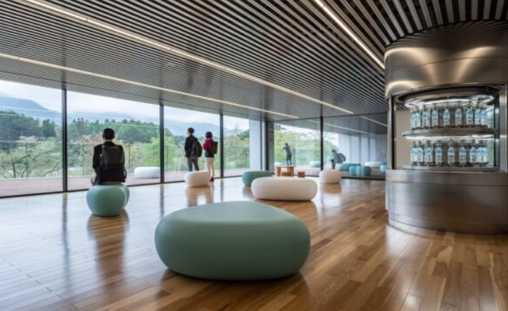 標高約700m、北アルプスの清らかな森に抱かれた施設では、天然水が生まれるまでの映像や展示で学べるほか、製造ラインの見学や環境への取り組みも紹介。