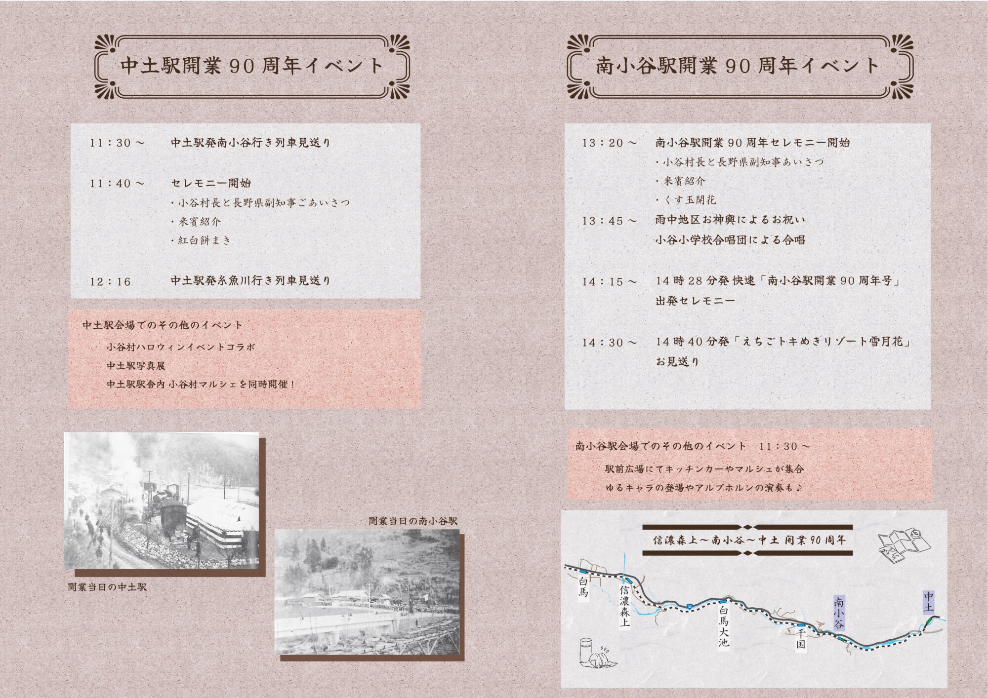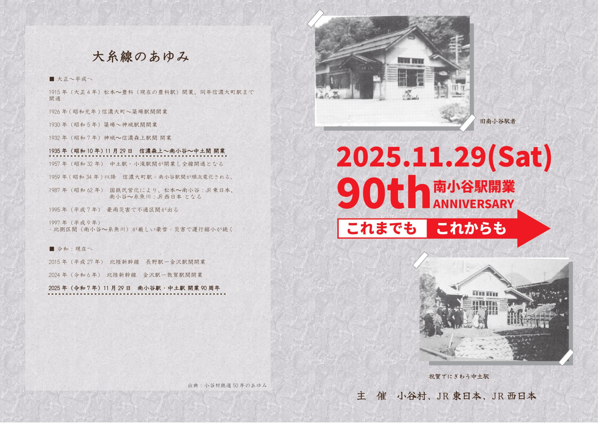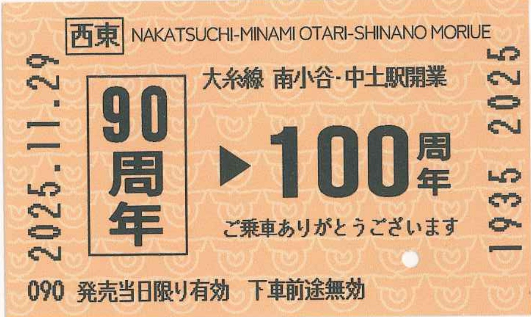 2025/11/29(土)にJR 大糸線信濃森上~中土駅間開通及び南小谷駅中土駅開業90周年記念イベントが両駅にて開催され、多くの参加者にご来場いただいたことに心より感謝申し上げます。 たくさんの方が当日限定で配られた記念切符を持ち、改めて100周年の南小谷・中土駅に向かって出発進行しました。